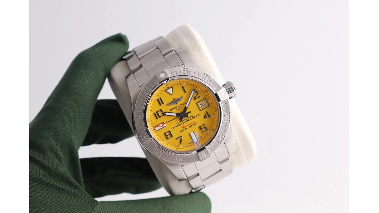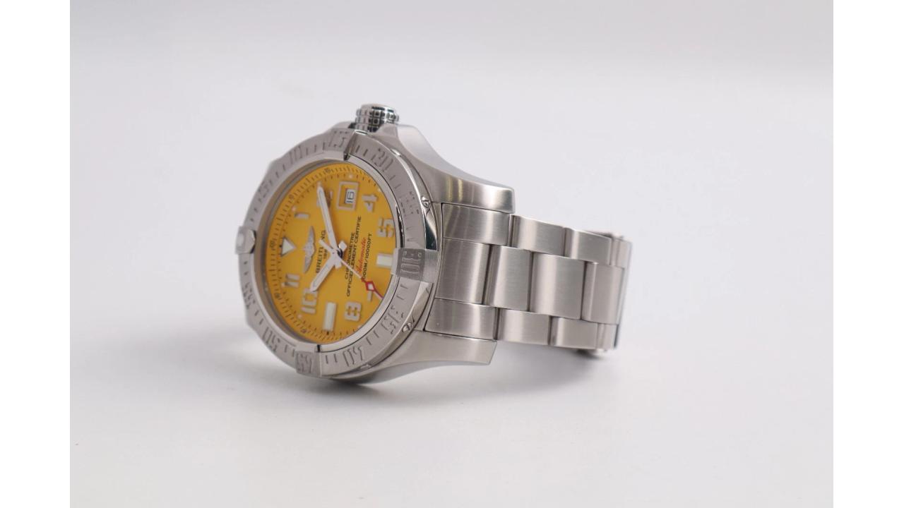 The Breitling Avenger II Seawolf A17331 is a professional "super-diver" engineered to survive at depths where few other timepieces can follow. Featuring an astonishing water resistance rating of 3,000 metres (10,000 ft), it represents the absolute peak of Breitling’s technical prowess. The vibrant "Cobra Yellow" dial provides maximum underwater visibility and serves as a bold aesthetic signature for the modern adventurer. Its massive $45 mm$ steel case is equipped with a decompression valve to equalize internal pressure during saturation diving. Inside, the COSC-certified Breitling 17 automatic movement ensures chronometric precision under the most extreme conditions. The unidirectional bezel features a high-grip knurled edge, designed for clinical accuracy when tracking dive durations. This timepiece is a formidable tool that combines a powerful, technical aesthetic with uncompromising Swiss reliability.
