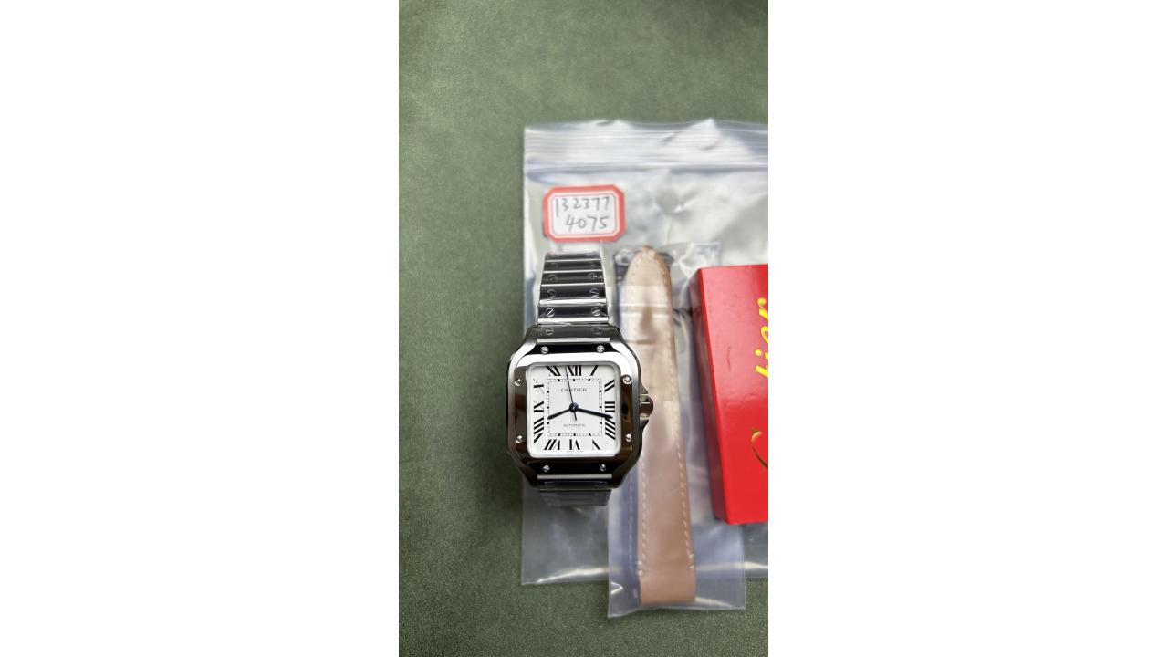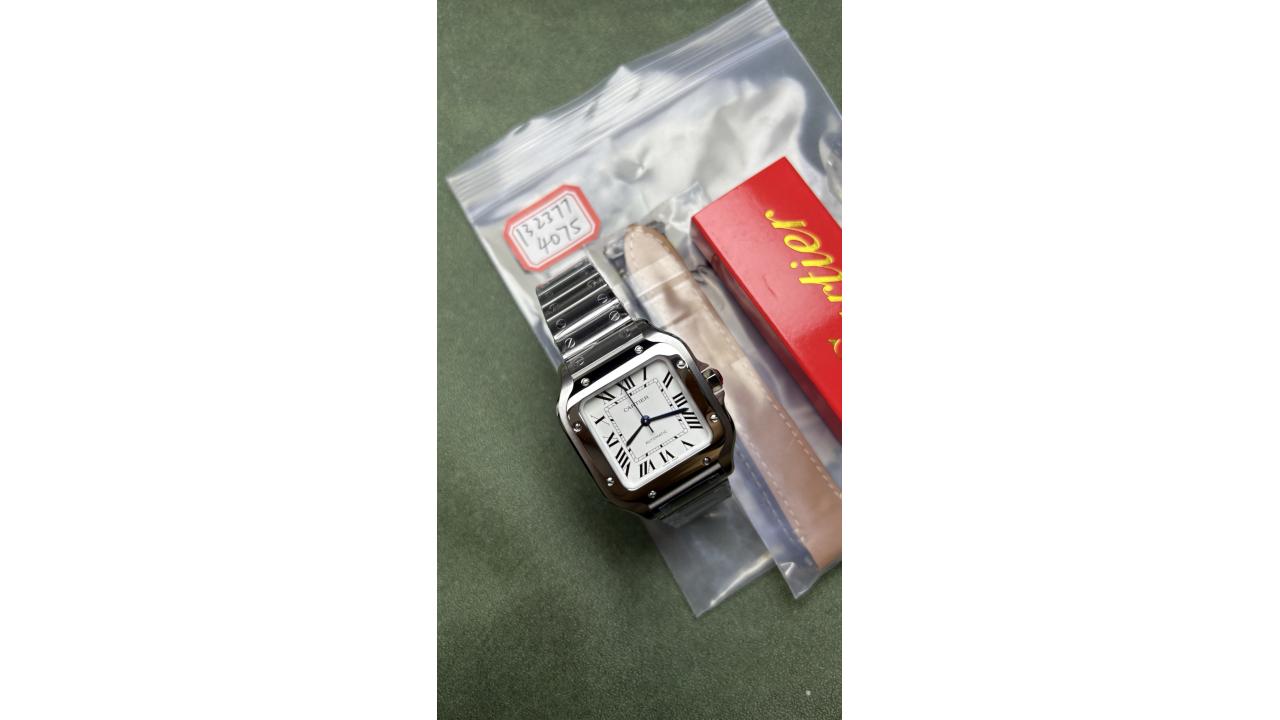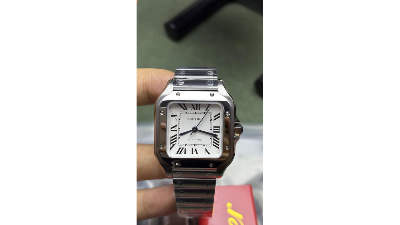 This stunning medium-sized model features a highly refined stainless steel case characterized by its iconic square bezel and signature exposed structural screws. Its beautiful silvered opaline dial is flawlessly executed, showcasing crisp Roman numerals, the classic hidden Cartier signature, and dynamic steel sword-shaped hands. Engineered for exceptional wearability, this timepiece boasts a remarkably slender profile of approximately 9.0 mm, allowing it to slide effortlessly beneath a dress cuff. At its heart beats the reliable AF 9015 automatic movement, ensuring a smooth, continuous sweep of the seconds hand and robust daily accuracy. Adding to its modern versatility, the stainless steel bracelet is equipped with fully functional QuickSwitch and SmartLink systems, enabling tool-less strap changes and instant link adjustments. Perfectly bridging the gap between a robust sports watch and a refined dress piece, this 35mm Santos is the ultimate everyday companion.