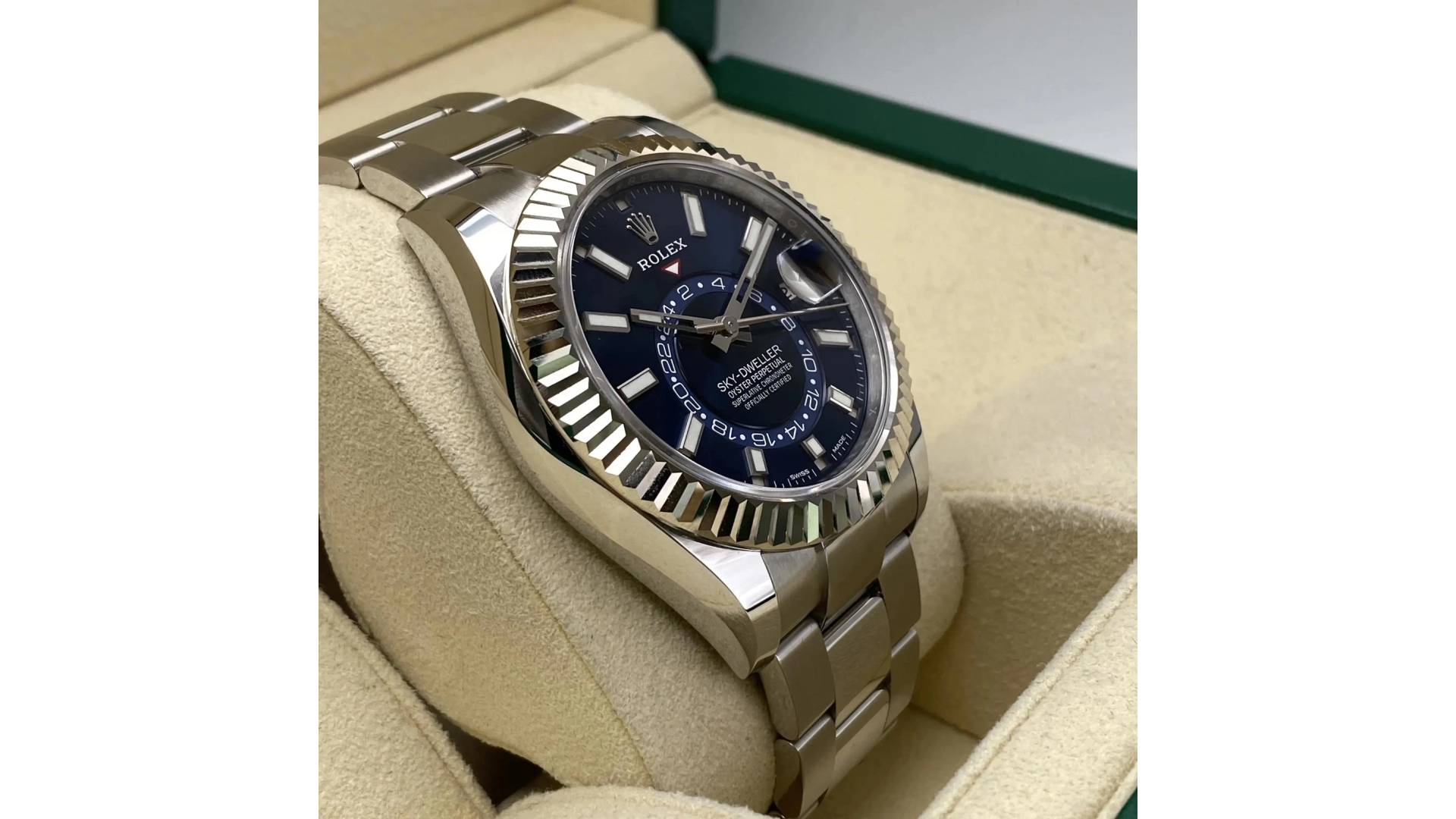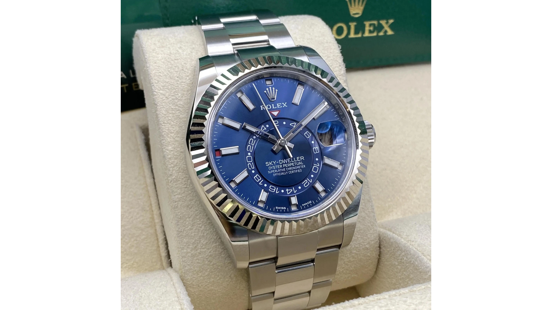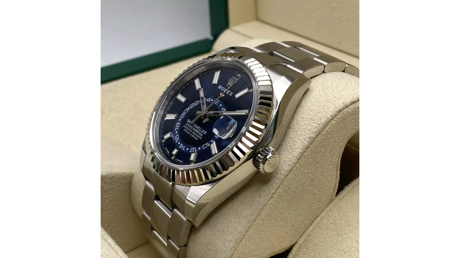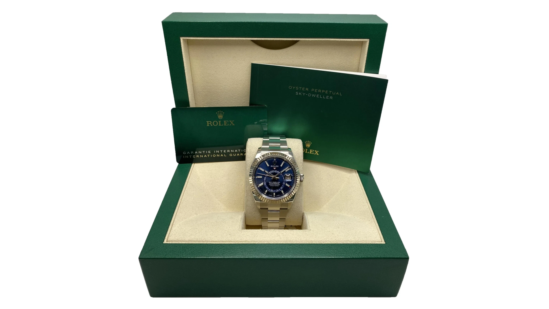 The Rolex Sky-Dweller Reference 326934 is perhaps the most sought-after configuration of Rolex's most complex watch. It combines the robust appeal of an Oystersteel case and bracelet with the subtle luxury of an 18k white gold fluted bezel. The bezel is not merely decorative; it is the innovative Ring Command system, allowing the wearer to easily set the watch’s functions: local time, reference time, and annual calendar. The standout feature of this 42mm timepiece is the vibrant blue dial, offering a stunning sunray finish that captures the light beautifully. The dial layout is intuitive, with an off-centre 24-hour disc for the second time zone and discreet apertures for the month display. The engineering marvel within is the Rolex Calibre 9001 (or the updated 9002 in the very latest models), a highly complex automatic movement ensuring Superlative Chronometer precision and a 72-hour power reserve. The combination of the steel construction, the mesmerizing blue dial, and the technical sophistication makes this reference exceptionally desirable. Presented with box and papers.