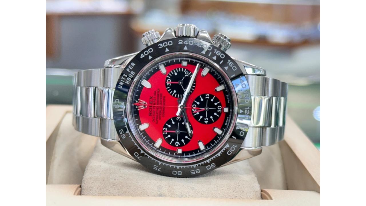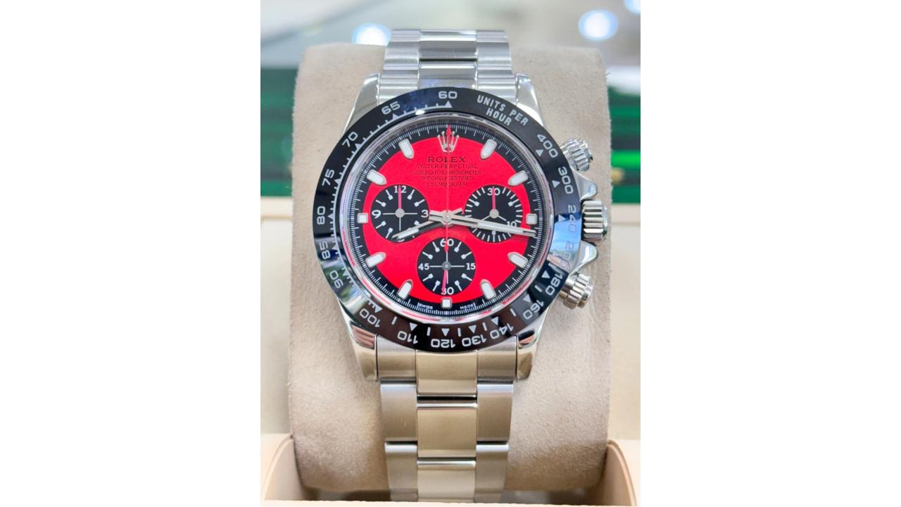 This Rolex Daytona 116520 is a masterclass in aggressive horological styling, reimagining the world’s most iconic chronograph for the modern collector who demands total exclusivity. The classic 40-mm VSF Oystersteel case has been upgraded with a bespoke black Cerachrom ceramic bezel, featuring an engraved tachymetric scale for a contemporary "ceramic look" that offers superior scratch resistance. Its centerpiece is a stunning custom vibrant red dial with contrasting black subdials, delivering a high-intensity racing aesthetic that captures the essence of motor sport heritage. Powered by the VSF Calibre 4130 in-house movement, the watch features a 72-hour power reserve and a precision vertical clutch for flawless chronograph operation. The signature Oyster bracelet provides a robust and sophisticated feel, ensuring a versatile presence that transitions effortlessly from the track to the boardroom. Water-resistant to 100 meters and secured by screw-down pushers and a Triplock crown, this watch maintains its professional tool-watch capabilities while offering a one-of-a-kind visual profile. Presented in exceptional condition, this red-and-black custom Daytona is a definitive statement piece for those who lead where others follow.